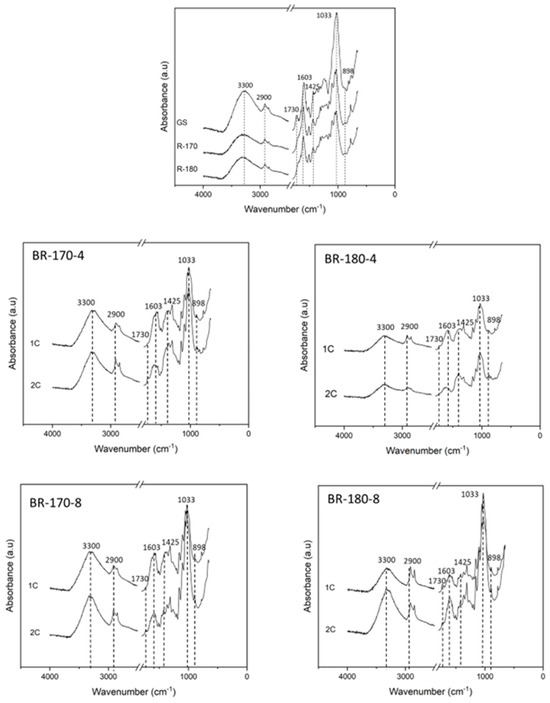 FTIR spectra of grape stalk (GS), non-bleached samples (R-170 and R-180) and samples bleached with 4 or 8% v/v alkaline hydrogen peroxide solutions (BR-170-4, BR-170-8, BR-180-4, and BR-180-8) after one and two bleaching cycles (1C–2C).