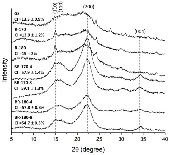 In lignocellulosic natural fibres, cellulose shows a semicrystalline structure, unlike hemicellulose and lignin, which are amorphous and have no effect on total crystallinity [38]. The X-ray diffraction spectra of GS, the SWE-insoluble fractions (R-170 and R-180), and the bleached residues (BR) coming out from the second bleaching at either 4% or 8% hydrogen peroxide (BR-170-4, BR-170-8, BR-180-4, and BR180-8) are shown in Figure 6, where the diffraction peaks characteristic of the type I cellulose crystalline lattice at 2θ = 15°, 16°, 22°, and 34° have been indicated [42].
