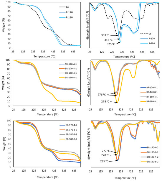 Thermogravimetric analysis (TGA) and DGTA curves of the grape stalk (GS), non-bleached subcritical water extraction residues (R-170 and R-180) and the bleached residues (BR) after one and two bleaching cycles with 4% or 8% (v/v) alkaline hydrogen peroxide solutions. Bleached residues are coded as BR temperature of subcritical water extraction concentration (%) of hydrogen peroxide-number of 1 h bleaching cycles.