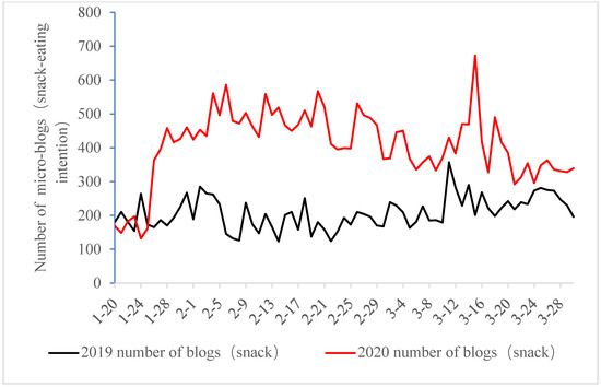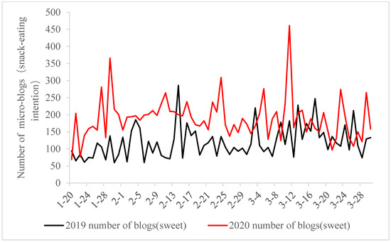 This study, which examines microblogs connected to sweet and snack intentions, reveals the increasing prevalence of the topics “want to eat snacks” and “want to eat sweets” during the COVID-19 pandemic in 2020. As shown in Figure 1, the number of microblogs related to snack-eating intention amounted to 29,598, much bigger than 14,714 during the same period in 2019. As shown in Figure 2, blogs that show sweet-eating motivation manifest the same trend as snack-eating, and the number during the pandemic period of 2020 is 13,194, higher than 8810 in the same period of 2019. In terms of snack-eating intention, the number of microblogs on snack-eating motivation continued to increase after 27 January 2020, as isolated management measures improved gradually in all Chinese provinces and cities. This trend was not seen at the same time last year. After that, it saw a slow decrease in foreign assaults at the end of February 2020.