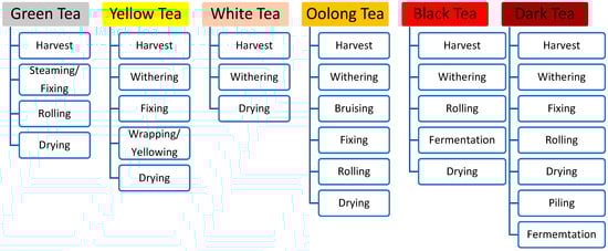 Tea can be broadly divided into six types based on the various processing methods, including dark, black, oolong, yellow, green, and white teas (Figure 1) [4,7]. Their sensory qualities, including the appearance of the dry tea, its infusion color, aroma, and tastes, differ markedly although all teas are produced using the tender shoots of Camellia sinensis consisting of one bud and two or three leaves. The different types of tea, and then various name brands and grades within each can have different and unique scents, tastes, and bioactive ingredients since tea contains a large variety of chemicals. The quality of tea is often evaluated by sensory analyses based on human perceptions using sensory descriptors, including morphological traits, tastes, aromas, textural mouthfeel, and colors [8,9]. Moreover, a variety of analytical methods have been developed for tea quality evaluations, including capillary electrophoresis (CE), plasma atomic emission spectrometry, gas chromatography–mass spectrometry (GC–MS), ultraperformance liquid chromatography (UPLC), and near-infrared spectroscopy (NIRS). More recently, the popularity of the electronic eye, tongue, and nose has increased rapidly.