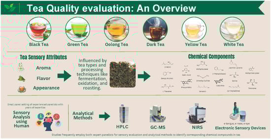 Tea, one of the world’s most consumed beverages, has a rich variety of sensory qualities such as appearance, aroma, mouthfeel and flavor. This review paper summarizes the chemical and volatile compositions and sensory qualities of different tea infusions including black, green, oolong, dark, yellow, and white teas based on published data over the past 4 years (between 2021 and 2024), largely focusing on the methodologies. This review highlights the relationships among the different processing methods of tea and their resulting chemical and sensory profiles. Environmental and handling factors during processing, such as fermentation, roasting, and drying are known to play pivotal roles in shaping the unique flavors and aromas of different types of tea, each containing a wide variety of compounds enhancing specific sensory characteristics like umami, astringency, sweetness, and fruity or floral notes, which may correlate with certain groups of chemical compositions. The integration of advanced analytical methods, such as high-performance liquid chromatography (HPLC) and gas chromatography–mass spectrometry (GC–MS), with traditional sensory analysis techniques was found to be essential in the evaluation of the chemical composition and sensory attributes of teas. Additionally, emerging approaches like near-infrared spectroscopy (NIRS) and electronic sensory methods show potential in modern tea evaluation. The complexity of tea sensory characteristics necessitates the development of combined approaches using both analytical methods and human sensory analysis for a comprehensive and better understanding of tea quality.