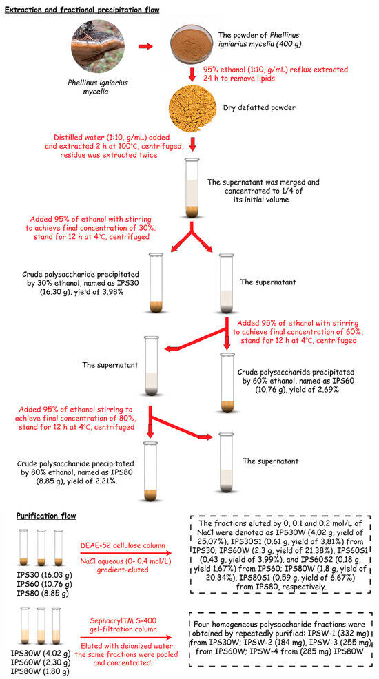 Flow diagram of the extraction, fractionation, and purification of water-soluble intracellular polysaccharides from P. igniarius mycelia.