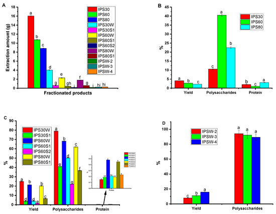 (A) Amounts of fractionated products. (B–D) The yield and content of carbohydrate and protein of (B) crude polysaccharides, (C) polysaccharides by DEAE-52 cellulose column chromatography, (D) polysaccharides by SephacrylTM S-400 gel-filtration column chromatography. Note: Different letters within groups indicate significant differences in the same column, p < 0.05. For (C), the yield (%) calculation is based on dry ethanol fractional polysaccharides IPS30, IPS60, and IPS80, respectively. For (D), the yield (%) calculation is based on dry separation products by DEAE-52 cellulose column chromatography. IPSW-1 is from IPS30W, IPSW-2 and IPSW-3 from IPS60W, and IPSW-4 from IPS80.