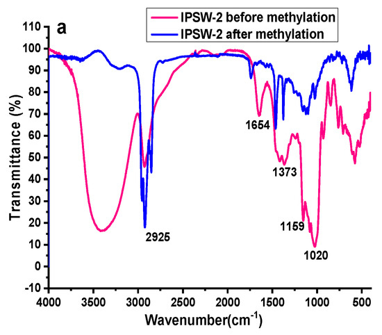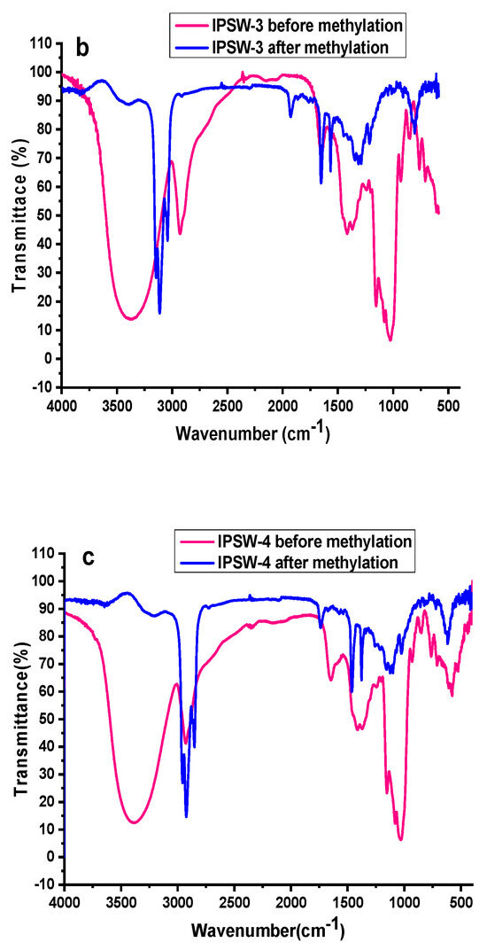 FT-IR spectrum of IPSW-2 (a), IPSW-3 (b), and IPSW-4 (c) before methylation and after methylation.