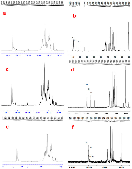 a–b: NMR spectra of IPSW-2 using (a) 1H NMR and (b) 13C NMR. c–d: NMR spectra of IPSW-3 using (c) 1H NMR and (d) 13C NMR. e–f: NMR spectra of IPSW-4 using (e) 1H NMR and (f) 13C NMR. Note: For (b): A, B, C, and D are 99.70, 99.62, 95.84, and 98.55 ppm, respectively; for (d): A, B, and C are 99.71, 99.59, and 95.77 ppm, respectively; and for (f): A, B, C, and D are 99.72, 99.60, 95.81, and 98.54 ppm, respectively.