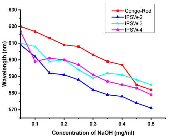 Under alkaline conditions, Congo red can form complexes with polysaccharides containing helical conformations, and the maximum absorption wavelength of the complex will also change with different concentrations of sodium hydroxide. If the polysaccharide contains a regular triple-helix structure, generally within the range of low sodium hydroxide concentrations, the complex’s maximum absorption wavelength will shift to longer wavelengths. As the concentration of the alkali solution gradually increases, the maximum absorption wavelength of the solution will decrease due to the unwinding of the triple helix and the formation of complexes. The change in the maximum wavelength of the IPSW-2 Congo red solution with sodium hydroxide concentration is shown in Figure 5. It can be seen from the figure that the homogeneous polysaccharide IPSW-2 cannot red-shift the maximum absorption wavelength of Congo red at low concentrations, so it does not have a regular triple-helix structure. A similar trend was observed for IPSW-3 and IPSW-4 (Figure 5). In general, non β-(1→3)-glucans or other polysaccharide chains cannot give this color reaction with Congo red. Nonetheless, the length of the main and branch chain, and the presence or absence of the branch chain of β-(1→3)-glucans, can impact the stability of triple-helix strands [60]. In future studies, a circular dichroism test may be supplemented to confirm the absence of trihelix structures