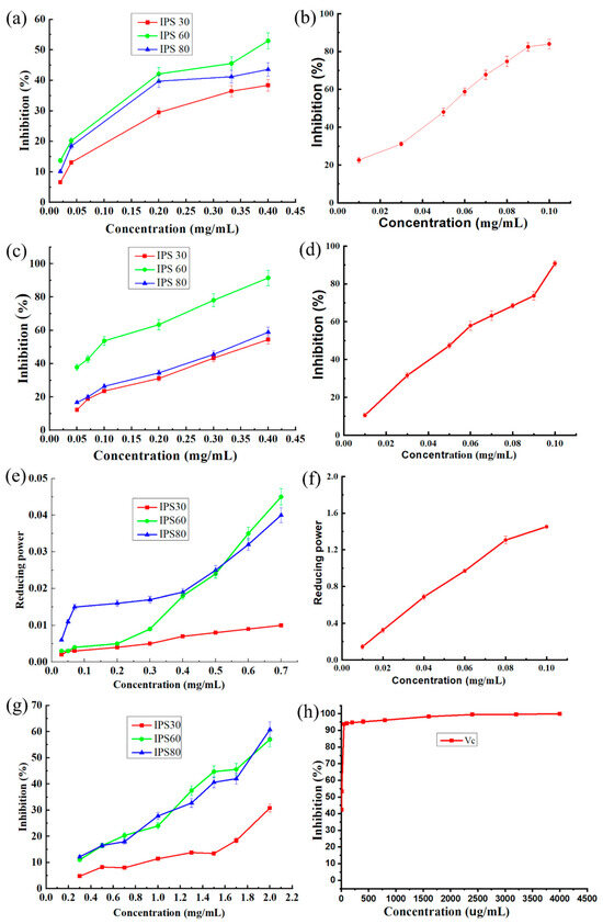 a–b: Scavenging activity (% inhibition) of (a) IPS30, IPS60, and IPS80 and (b) vitamin C on superoxide anion radicals. c–d: Scavenging activity of (c) IPS30, IPS60, and IPS80 and (d) vitamin C on hydroxyl radicals. e–f: The reduction power of (e) IPS30, IPS60, and IPS80 and (f) vitamin C radical. g–h: Scavenging activity of (g) IPS30, IPS60, and IPS80 and (h) Vitamin C on DPPH.