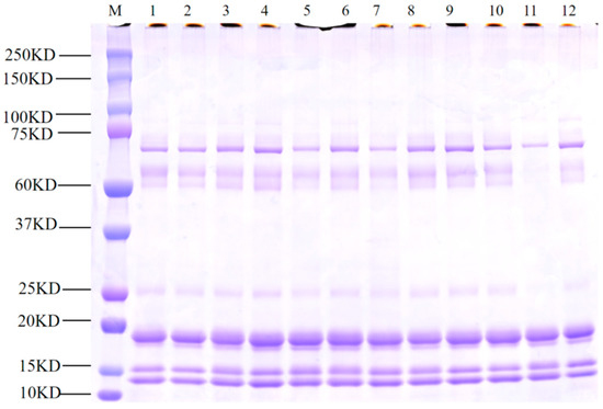 The electropherogram shows the whey proteins using SDS-PAGE. Lane M: standard protein markers (low-range rainbow marker, Lanes 1–12 proteins from mare milk).