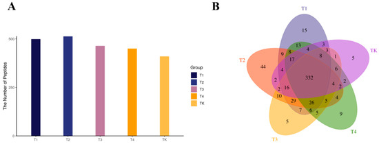In the following steps, we analyzed endogenous peptide profiles with mare whey protein samples heated at 65, 72, 83, and 95 °C and used the untreated group as a blank control using LC–MS/MS combined with a search of the PEAKS X+ database. An overall analysis of all samples identified 2341 unique peptides corresponding to 14 different proteins. A total of 2341 active peptides were identified in 15 samples from five test groups. Among them, 500 active peptides were identified in group T1, 514 in group T2, 465 in group T3, 451 in group T4, and 411 in group TK (Figure 3A). There were 332 active peptides common to all five test groups. There were 15 specific active peptides in group T1, 44 specific active peptides in group T2, five specific active peptides in group T3, nine specific active peptides in group T4, and five specific active peptides in group TK (Figure 3B). The other 935 peptides had repeats in multiple groups.