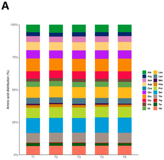 In order to understand the composition of amino acids in the samples and the differences between the groups, a Column Accumulation Chart was used to analyze the whole amino acid composition of the polypeptides. The composition of amino acids did not change significantly with an increase in temperature (Figure 4A).