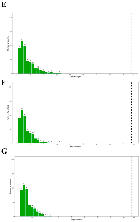 The molecular weight and length of polypeptides can affect digestion and absorption in the body, the activation of enzyme systems, and the growth and fermentation of microorganisms. To analyze the distribution of the molecular weight and length of polypeptides between the sample groups and the similarities and differences in polypeptide spectra among different groups, a column accumulation diagram was used. The molecular weights of the peptides identified in the T1, T2, T3, T4, and TK samples were primarily in the range of 1–1.5 kDa, followed by some peptides in the range of <1 kDa, and a few peptides in the range of 1.5–3 kDa (Figure 4B). There was no significant difference in peptide abundance among T1, T2, T3, T4, and TK, indicating that temperature had no significant effect on peptide abundance (Figure 4C). Peptides composed of 2 to 10 amino acids are short peptides, and peptides composed of 10 to 50 amino acids are long peptides. The T1 group had 324 short peptides and 175 long peptides (Figure 4D). The T2 group had 309 short peptides and 205 long peptides (Figure 4E). The T3 group had 305 short peptides and 160 long peptides (Figure 4F). The T4 group had 298 short peptides and 147 long peptides (Figure 4G). The TK group had 285 short peptides and 126 long peptides (Figure 4H).