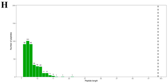 (A) The horizontal coordinate represents the group name, the vertical axis represents the percentage of amino acids, and the color represents the 20 amino acids. (B) A statistical accumulation map of the number of polypeptides in different molecular weight intervals for each group of samples. (C) The abundances of peptides in different molecular weight ranges for each group of samples. The horizontal coordinate is the group name, and the vertical coordinate represents the peptide abundance (signal response strength) at different molecular weights. (D–H) The quantitative distribution of the length of identified polypeptides. Note: The collected milk was treated at different temperatures, including T1 (D), T2 (E), T3 (F), T4 (G), and TK (H). The peptide content here is relative, not absolute.