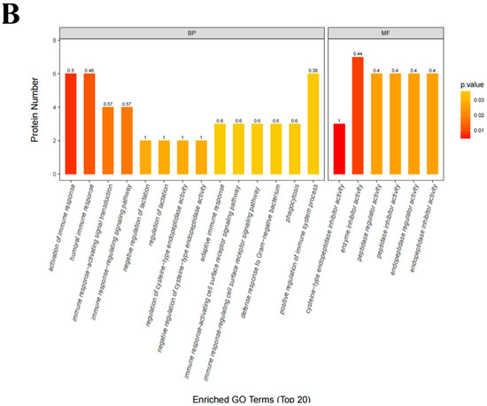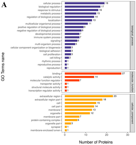 In total, 2341 active peptides were identified in 15 samples from the five test groups. The functions of the identified proteins were annotated using a GO analysis and metabolic pathway analysis (Figure 5A). The GO analysis revealed that these proteins were mainly related to biological processes (BPs), such as a cellular process, biological regulation, a reaction to a stimulus, a metabolic process, the moulation of a biological process, and localization; cellular components (CCs), such as the extracellular region, a part of the extracellular region, the cell, a part of the cell, and the membrane; and molecular functions (MFs), such as binding, catalytic activity, and increased molecular function(Figure 5B).