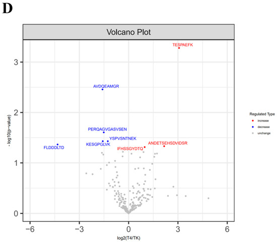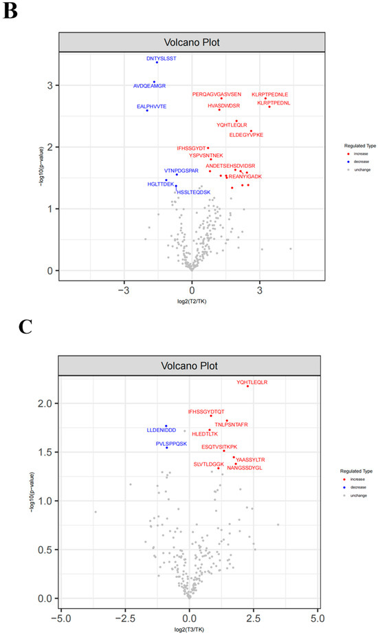 Volcano plots of bioactive peptides in mare milk at different temperature stages, utilizing bioinformatic and polypeptidomic analyses. Note: Milk samples were collected from Nanshan mares at four different temperature stages, 65 (A), 72 (B), 83 (C), and 90 °C (D), and 0 °C (TK). Note: Additional milk samples were collected from Nanshan mares at four different temperature stages, designated as T1VSTK (A), T2VSTK (B), T3VSTK (C), and T4VSTK (D). Change here refers to relative content change, not absolute content change.