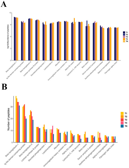 (A) Histogram of the number of proteins corresponding to polypeptides. (Description: the horizontal axis represents the protein name (top 15), and the vertical axis represents the number of peptides). (B) Histogram of proteins corresponding to polypeptide abundance. (Description: the horizontal axis represents the protein name (top 15), and the vertical axis represents the peptide abundance, indicated by signal response strength, under different molecular weights).