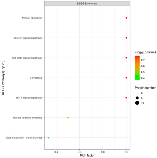The bioactive peptides identified through heat treatment can be categorized into CC, MF, and BP based on their functions. The GO analysis showed that increased peptide expression was primarily related to BPs (Figure 9), such as mineral absorption, the prolactin signaling pathway, the TGF-beta signaling pathway, and ferroptosis. By contrast, a decrease in peptide expression was mainly related to MFs and BPs, such as other drug-metabolizing enzymes and thyroid hormone synthesis (Table 2).
