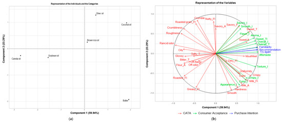 Results of Multiple Factor Analysis (MFA) by sensory characteristics, consumer acceptance, and purchase attention of six cookie samples; plots for samples (a) and sensory characteristics identified using CATA, consumer acceptance, and purchase intention (b).