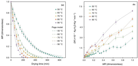 Drying kinetics of raspberry pomace: (a) time-dependent changes in moisture ratio (MR) at varying temperatures (50, 60, 70, 80, and 90 °C), fitted to the Page model; (b) drying rate (DR) as a function of MR at corresponding temperatures for raspberry pomace.