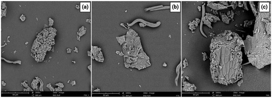 SEM micrographs of raspberry pomace at drying treatments: (a) 50 °C, (b) 70 °C, and (c) 90 °C.