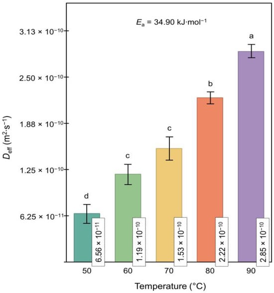 Effective moisture diffusivity (Deff) of raspberry pomace at different drying temperatures (50, 60, 70, 80, and 90 °C). The activation energy (Ea) was calculated as 34.90 kJ·mol−1. Significant differences between treatments (p < 0.05) are indicated by different letters above the bars.