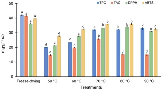 Antioxidant activity and phenolic content of DRP under different drying temperatures (50, 60, 70, 80, and 90 °C), including freeze-drying as a control. Total phenolic content (TPC, mg GAE·g−1 db), total anthocyanin content (TAC, mg C3G·g−1 db), and DPPH and ABTS activities (mg AAE·g−1 db). Significant differences among treatments (p < 0.05) are indicated by different letters (a–d) above the bars.