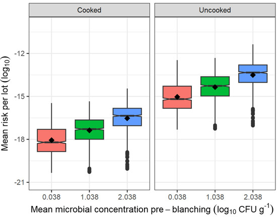 Therefore, according to the present QRA model, it can be deduced that, on a batch basis, the contribution of the incoming raw produce to the final risk is greater than the contribution of re-contamination post-blanching. In environments that have been proven to harbor L. monocytogenes niches and lead to frequent cross-contamination, such as those of deli meats retail establishments, a QRA model [57] demonstrated that minimizing the incoming L. monocytogenes cells and the transfers from the environment or niches directly decreases the predicted risk of illness; and that more frequent environmental contamination events have more impact on risk than a greater number of L. monocytogenes cells per cross-contamination event.