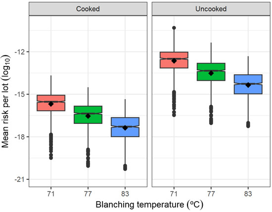 Effect of blanching temperature and home cooking status on the mean risk of listeriosis in a serving per lot.