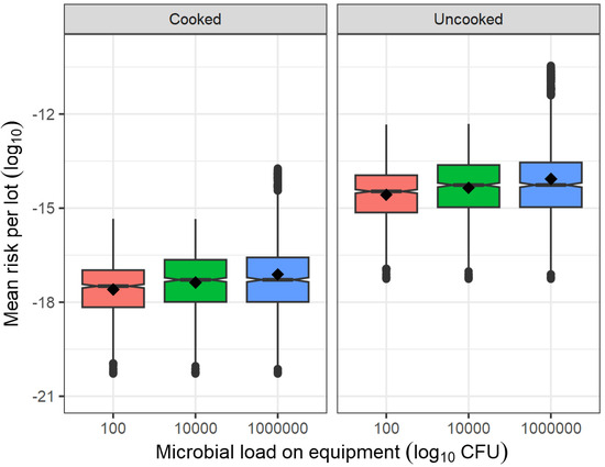 The model of EFSA [7] also assessed consumer’s handling scenarios, and in the case of cooking, they predicted that in contrast to consuming uncooked servings, the consumption of cooked servings reduces the mean risk of listeriosis by 3.2 log10 in the female susceptible population and by 3.5 log10 in the male susceptible population, which are both reduction levels of comparable magnitude to our estimation. Nonetheless, in absolute terms, EFSA’s model [7] predicted higher mean risk of illness at 4.0 × 10−10 and 1.9 × 10−9 for uncooked servings and 2.3 × 10−13 and 5.3 × 10−13 for cooked servings, in the female and male susceptible populations, respectively.