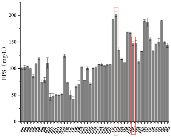Yield of 52 strains of lactic acid bacteria EPS. The red boxes represent the two selected strains, Ls5 and Fs7.