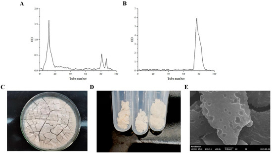 EPS produced by the two strains were isolated, purified, and characterized. The elution curves of EPS from the target strains are shown in Figure 3A,B. The collected sample solution was subjected to multiple concentration steps, including spinning, dialysis, and lyophilization, as shown in Figure 3C–E. The resulting EPS had a slightly yellowish color and a loose and porous structure. The further purified EPS was white, lightweight, and slightly sticky. Electron microscopy analysis of the purified EPS revealed a rough surface with numerous small, dense holes dispersed throughout.