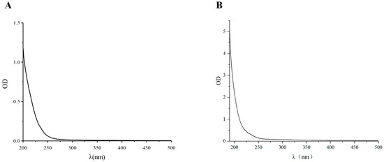 As depicted in Figure 4A,B, purified EPS at both 260 and 280 nm were smooth and flat without any distinct peaks. This finding indicated that the sample contained minimal nucleic acids and proteins, suggesting a high level of purity.