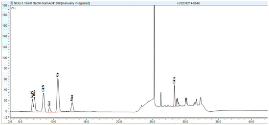 Monosaccharide composition of Ls5 EPS. Abbreviations in the figure represent the following monosaccharides: Galactosamine (GalN), Rhamnose (Rha), Glucosamine (GlcN), Galactose (Gal), Glucose (Glc), Mannose (Man), Galacturonic Acid (GalA), and Glucuronic Acid (GlcA).