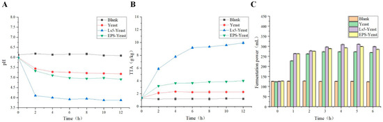 pH of different sourdough (A), TTA of different sourdough (B), Comparison of the fermentation capacity of different sourdough (C).