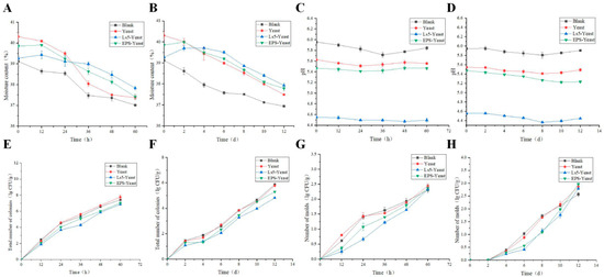Moisture changes of Mantou at room temperature (A), Moisture change of Mantou at 4 °C (B), pH change of Mantous at room temperature (C), pH change of Mantou at 4 °C (D), The total number of colonies in Mantous changed at room temperature (E), The total number of colonies in Mantous changed at 4 °C (F), Changes in the number of molds in Mantous at room temperature (G), Changes in the number of molds in Mantous at 4 °C (H).