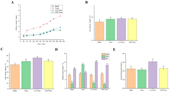 Starch can be converted into glucose through the action of amylase during digestion, thereby indicating the in vitro digestion properties of starch-based on the changes in glucose content. The graphs in Figure 11A illustrate the variations in glucose content in the Mantou of the Blank, Yeast, Ls5-Yeast, and EPS-Yeast groups over a 240-min period.