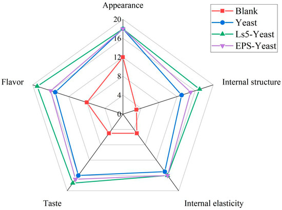 The visual characteristics of Mantou in the Yeast, Ls5-Yeast, and EPS-Yeast groups showed no significant differences. However, the internal structure of the Mantou in the three groups exhibited notable differences. The texture of the Yeast group was coarser than those of the other two groups, with slightly rougher stomata. Despite this, all three Mantou groups were deemed to have good taste. Ls5-Yeast and EPS-Yeast groups were particularly praised for their delicate texture, elasticity, and pleasant mouthfeel. Notably, the most prominent disparity among the groups was observed in the flavor profile of Mantou. The Ls5-Yeast group stands out for its superior flavor, which is characterized by a sweet taste and robust wheat aroma. In contrast, the variance in flavor between the Mantou of the EPS-Yeast group and the Yeast group was minimal. This suggests that while EPS significantly improved the texture of the Mantou, its impact on flavor enhancement was relatively modest.