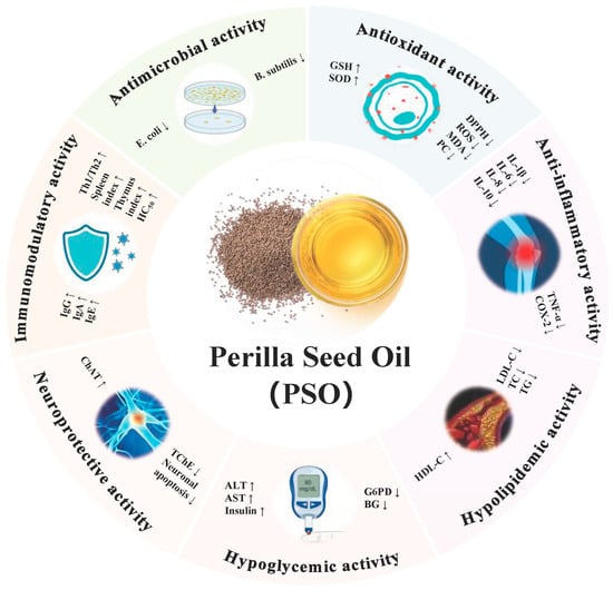The bioactivity of PSO (perilla seed oil) includes its effects in antimicrobial, antioxidant, anti-inflammatory, hypolipidemic, hypoglycemic, neuroprotective and immunomodulatory activities. Abbreviations: GSH, glutathione; SOD, superoxide dismutase; DPPH, 2,2-diphenyl-1-picrylhydrazyl; ROS, reactive oxygen species; MDA, malondialdehyde; LPO, lipid peroxidation; TNF-α, tumor necrosis factor-alpha; COX-2, cyclooxygenase-2; IL-1β, interleukin-1 beta; IL-6, interleukin-6; IL-10, interleukin-10; LDL-C, low-density lipoprotein cholesterol; TC, total cholesterol; TG, triglycerides; HDL-C, high-density lipoprotein cholesterol; ALT, alanine aminotransferase; AST, aspartate aminotransferase; G6PD, glucose-6-phosphate dehydrogenase; BG, blood glucose; ChAT, choline acetyltransferase; TChE, total cholinesterase; IgG, immunoglobulin G; IgA, immunoglobulin A; IgE, immunoglobulin E.