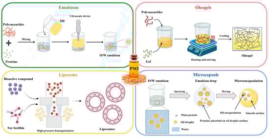 Due to the presence of a highly unsaturated double bond structure and bis-allyl methylene groups, PSO is prone to oxidation, isomerization and polymerization under external environmental stress, resulting in its low bioavailability. This inherent instability is closely associated with the hydrophobic characteristics of PSO [10]. These properties significantly limit the application of PSO during processing, storage and transportation, thereby diminishing its bioactivity and bioavailability. To address these issues, encapsulation techniques have been proven effective in retarding oxidative processes, thereby enhancing the stability of unsaturated lipids. Various encapsulation strategies have been developed to improve the bioavailability of PSO, including emulsions, oleogels, liposomes and microcapsules (Figure 2 and Table 2). These technological approaches help to overcome the stability challenges associated with the application of PSO.