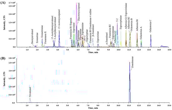 Interference from endogenous substances causes MEs, which can enhance or diminish the analyte signal and affect the accuracy and precision of the analytical results. Table 2 shows that 28 mycotoxins exhibited negligible or medium MEs, varying between −50% and 50%. In contrast, AFB1, AFB2, NIV, 3-AcDON, 15-AcDON, ZEA, and ZEA-4S toxins displayed stronger MEs (suppression of over 50%), as they had a greater vulnerability to matrix interference compounds. Similarly, AFB1, AFB2, NIV, 3-AcDON, and 15-AcDON have been reported to suppress ions in durum wheat samples [34]. Therefore, in this study, matrix-matched calibration was used to compensate for the external standard to solve the problem caused by the ME of mismeasurement.