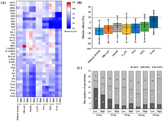 The results of the purification of the blank sample extract containing mycotoxins are shown in Figure 2. Commercially available d-SPE sorbents such as silica gel, Florisil, C18EC, PSA, Al2O3, and Z-sep clearly differed in their abilities to purify various substance classes. Figure 2A shows a heatmap of the recovery rates of the mycotoxins. When C18EC was used for cleanup, most mycotoxins were distributed close to white in the heatmap, indicating recoveries between 70% and 101% (see Table S2 for details). C18EC is known to provide high recoveries for both apolar and polar analytes by effectively removing nonpolar interfering substances, lipids, and sterols from the sample matrices [23,24]. Florisil is used for the separation of hydrophilic substances from non-aqueous nonpolar mixtures for the analysis of samples with high contents of sugars, acids, pigments, and organic ingredients [25]. Notably, the use of Florisil resulted in a lower recovery rate of AFs and EAs than those obtained with other sorbents, indicating that it had a strong absorption affinity for the polar groups in the structures of the target mycotoxins. This suggests that AFs, which represent a polar class of mycotoxins, were irreversibly adsorbed onto Florisil, leading to them not being recovered. Similar results were observed for several other mycotoxins (AFs, Et, Eco, Ecri, and Es), with low recoveries obtained owing to them being strongly absorbed by Florisil [26]. Furthermore, 50 mg of Florisil was used during the d-SPE of grains, indicating that the recovery of AFB1 was less than 40% [27]. The results for silica gel showed that the recoveries of some analytes such as OTs, FBs, and EAs were <72% at low concentrations. However, when the three materials with acidic interference removal functions (PSA, Al2O3, and Z-sep) were used for cleanup, the recovery of the FBs was lower than 50%. This inadequate recovery can be attributed to the acidic nature of the carboxylic groups in the FBs, which led to their adsorption onto the cleanup sorbents. In a study performed by Mateus [28] on pistachio nuts, FB1 and FB2 were similarly not detected by PSA and Z-sep, whereas C18 provided analytical signals for all 10 mycotoxins tested.