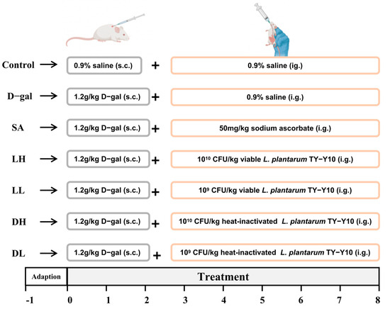 Shi, S.; Li, X.; Zhang, F.; Jiang, Z.; Wang, J.; Zhao, L.; Chen, J.; Shu, X.; Fang, B.; Liu, P.; et al. Alleviating D-Galactose-Induced Aging in Mice by Modulating Gut-Liver Axis Using Lactiplantibacillus plantarum TY-Y10. Foods 2024, 13, 3618. https://doi.org/10.3390/foods13223618