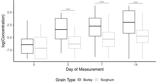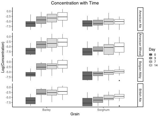 Statistics—Concentrations were analyzed on the log-scale due to a heavy right skew in the data. Repeated measure ANOVA with unstructured correlation was computed using the nlme package in R version 4.3.3. [26]. Using the fitted model, planned contrasts were computed to compare the difference in average concentration between barley and sorghum at each of the four time points [27]. Contrasts were additionally computed to compare the average concentration of each grain on the initial day of brewing with the final day [28].