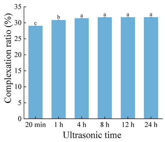 Complexation ratio at different ultrasonic times of the complex sample. Different letters indicate significantly different (p < 0.05).