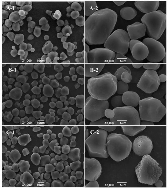 SEM pictures of native starch, mixture, and complex samples. (A-1,A-2) Native starch; (B-1,B-2) mixture sample; (C-1,C-2) complex sample; -1, 1000 magnification; -2, 3000 magnification.