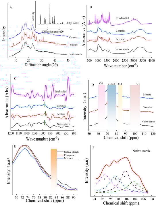 Figure 3B and Table 2 show that the mixture increases the number of infrared absorption peaks compared to native starch. Fourier infrared deconvolution revealed new absorption peaks at wave numbers 1180, 958, and 895 cm−1 in the mixture. This suggests that the peaks of the mixture are the total superposition of starch and ethyl maltol. The new absorption peaks of ethyl maltol were absent in the complex. The characteristic peak of ethyl maltol was obscured in the infrared spectrum of the complex, which may be caused by amylose coating ethyl maltol through hydrogen bonding and other forces to form a starch–ethyl maltol complex. Other studies have also shown that the peaks of ligand molecules are masked after their inclusion in the host structure [].