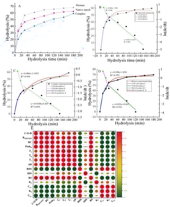 The hydrolysis curves (A), model fit curves, LOS plots (B–D), and correlation diagram (E) of native starch, mixture, and complex samples. E, Correlation analysis was performed using Pearson’s correlation analysis.