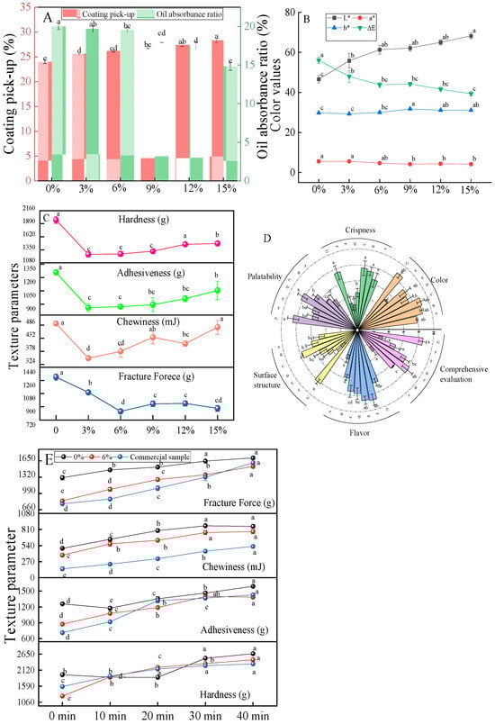 Coating pick-up (A), oil absorption ratio (A), color values (B), texture (C), rose diagram of artificial sensory evaluation (D) of the chicken nuggets prepared using the complex with different addition ratios, and the texture (E) of chicken nuggets fried at different times. In the rose diagram of the artificial sensory evaluation (D), the letters A–F are the samples prepared by the complex with different addition ratios (0%, 3%, 6%, 9%, 12%, and 15%), and the letter G is the commercial sample. The lowercase letters are significantly different (p < 0.05).