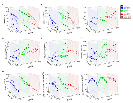 Effects of 1-MCP treatment on postharvest physiological qualities of kiwifruits. (A) firmness, (B) chlorophyll content, (C) browning index, (D) maturity index (SSC/TA), (E) reducing sugar content, (F) cellulase activity, (G) ascorbic acid content, (H) ABTS•+ free radical scavenging capacity, (I) ·OH free radical scavenging ability. XX, HY, and HWD represent ‘Xuxiang’, ‘Huayou’, and ‘Hayward’, respectively.