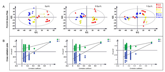Partial least squares discriminant analysis (PLS-DA) is a widely recognized method for extracting features and conducting discriminant analysis in the chemometrics field [80]. The impact of 1-MCP treatment on the kiwifruit storage metabolic profile can be depicted through PLS-DA distribution plots. In Figure 2A, kiwifruits untreated with 1-MCP exhibited distinct segregation trends on the first principal component at different storage stages (0 d, 6 d, and 15 d), while ‘Xuxiang’ demonstrated a clear trend of separation on the second principal component with the other two varieties (i.e., ‘Huayou’ and ‘Hayward’). After treatment with 0.5 μL/L 1-MCP, kiwifruits exhibited a marked tendency towards segregation on the second principal component as the storage period progressed. Furthermore, kiwifruits treated with 1.0 μL/L 1-MCP displayed a noticeable segregation trend on both the first and second principal components throughout the storage duration. The cross-validation graph (Figure 2B) results confirmed the reliabilities of the PLS-DA models.